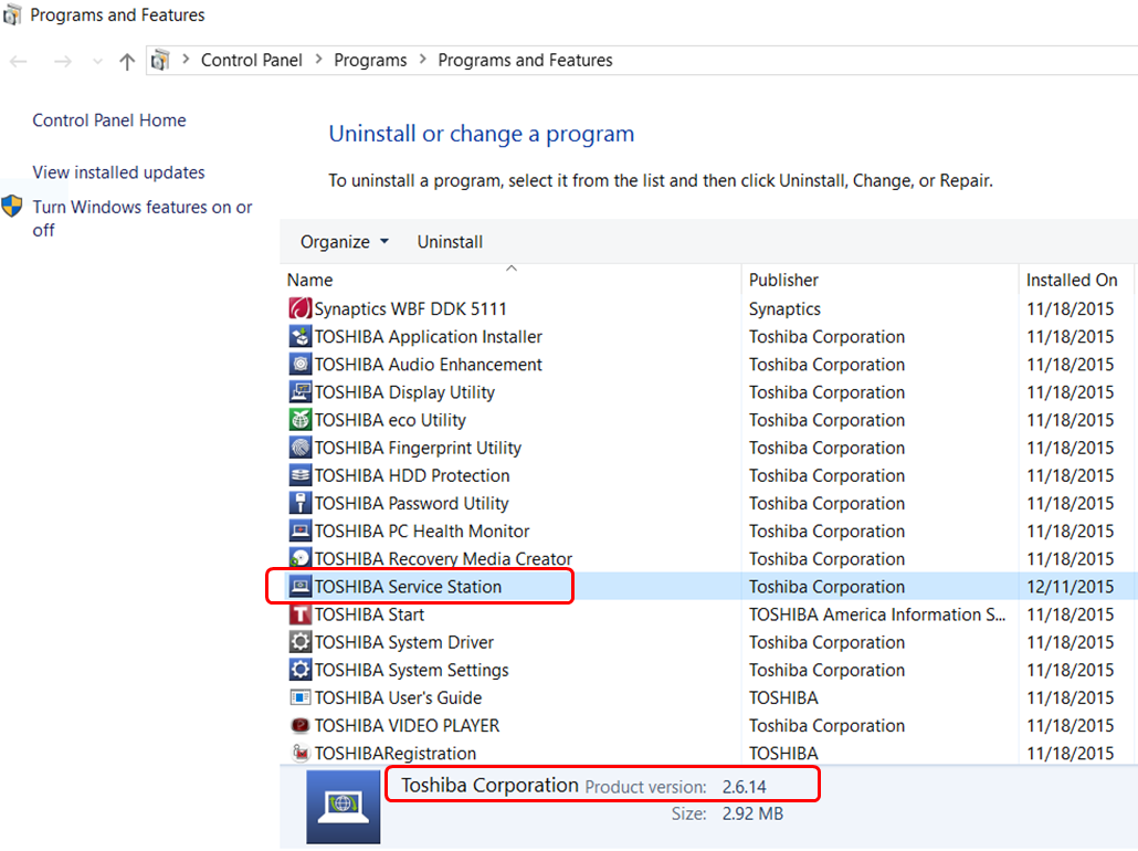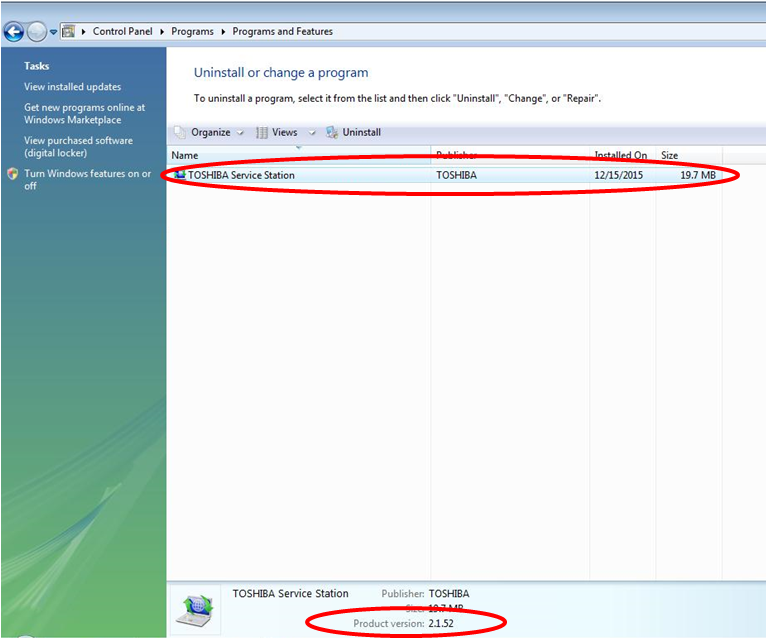 4. If you see Toshiba Service Station in the list of programs and the installed version is V2.2.14 or lower, click here or the version is 3.0.0.0, click here for download and follow the instruction that will be displayed on your screen. You can view the version number by left mouse clicking on TOSHIBA Service Station one time.