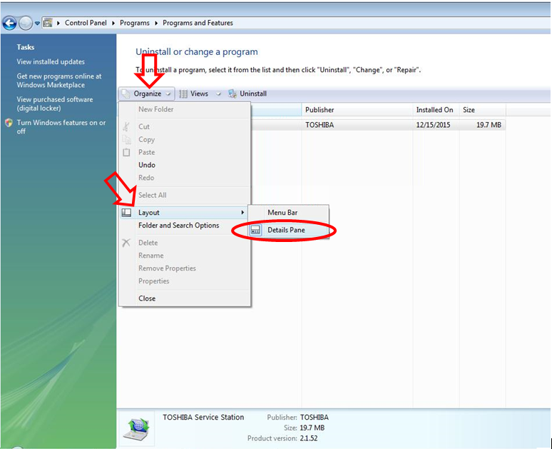 3. If you see Toshiba Service Station in the list of programs and the installed version is between V2.2.14 and 2.6.15, click here or the version is between 3.0.0.0 and 3.1.1, click here for download and follow the instruction that will be displayed on your screen. You can view the version number by left mouse clicking on TOSHIBA Service Station one time.