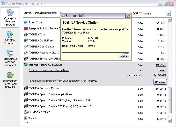 5. If you see Toshiba Service Station in the list of programs and the installed version is between V2.2.14 and 2.6.15, click here or the version is between 3.1.0.0 and 3.1.1, click here for download and follow the instruction that will be displayed on your screen. You can view the version number by left mouse clicking on TOSHIBA Service Station one time.