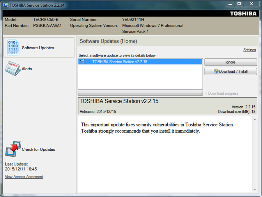 Toshiba Europe GmbH (Toshiba TEG) has released an important update to fix security vulnerabilities in Toshiba Service Station. Toshiba recommends that all affected users immediately update their PC’s software as described below to address these security vulnerabilities.